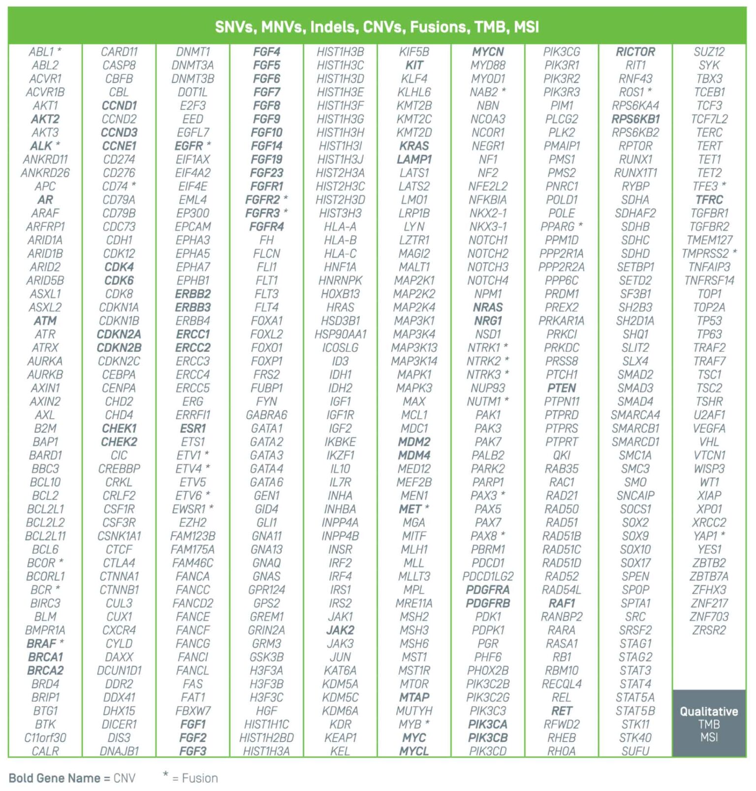 Summit 2.0 investigates cerebrospinal fluid (CSF) for clinically relevant variants known to be associated with brain and spinal cord cancers. The 500+ gene panel includes single nucleotide variants, multi-nucleotide variants, insertions, deletions, copy number variants, chromosomal arm level loss/gain, fusions, and the key biomarkers, TMB and MSI.